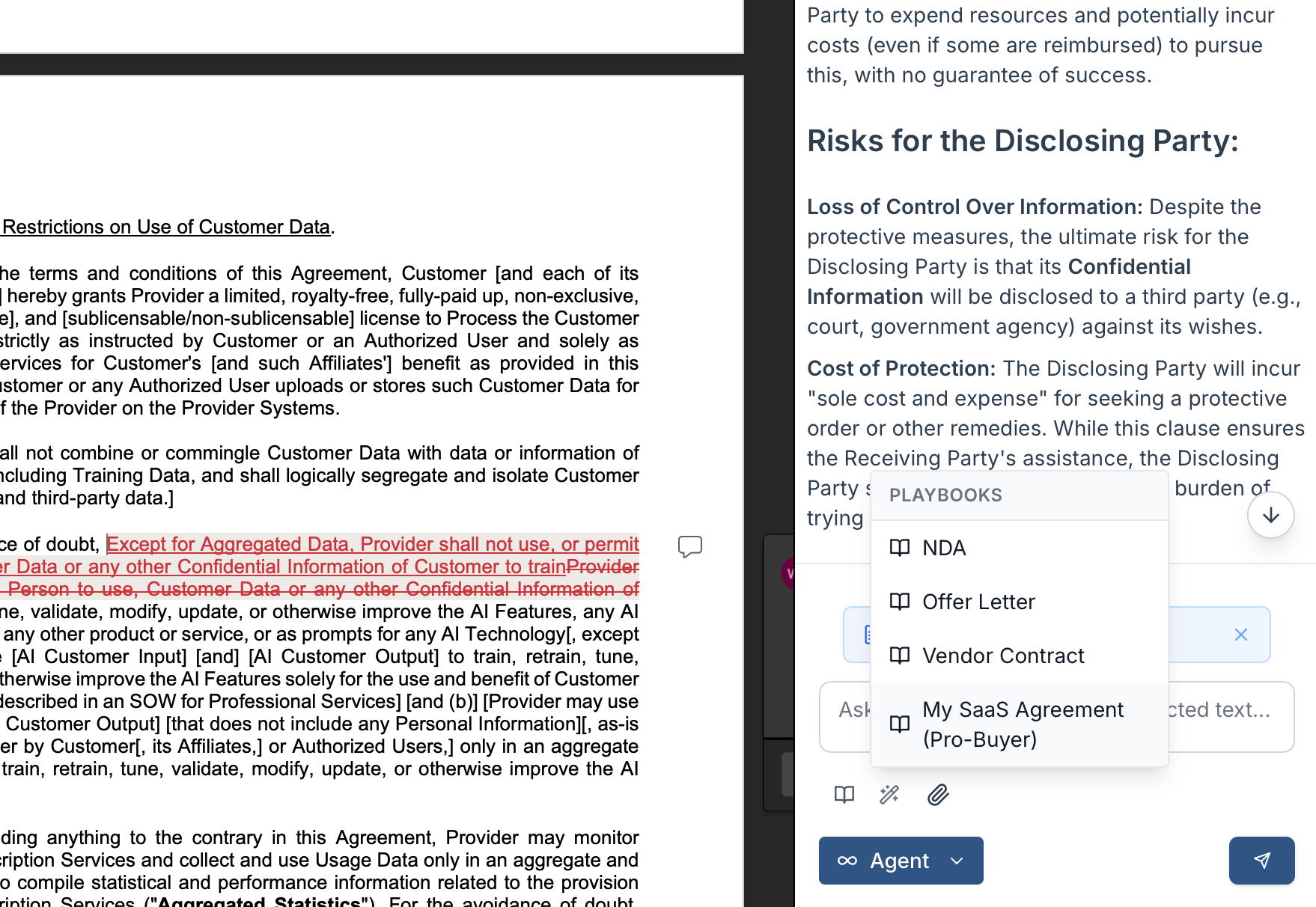 Receive immediate, context-aware analysis. The AI evaluates your document against your playbooks, market standards, your Firm IQ, and attached documents.